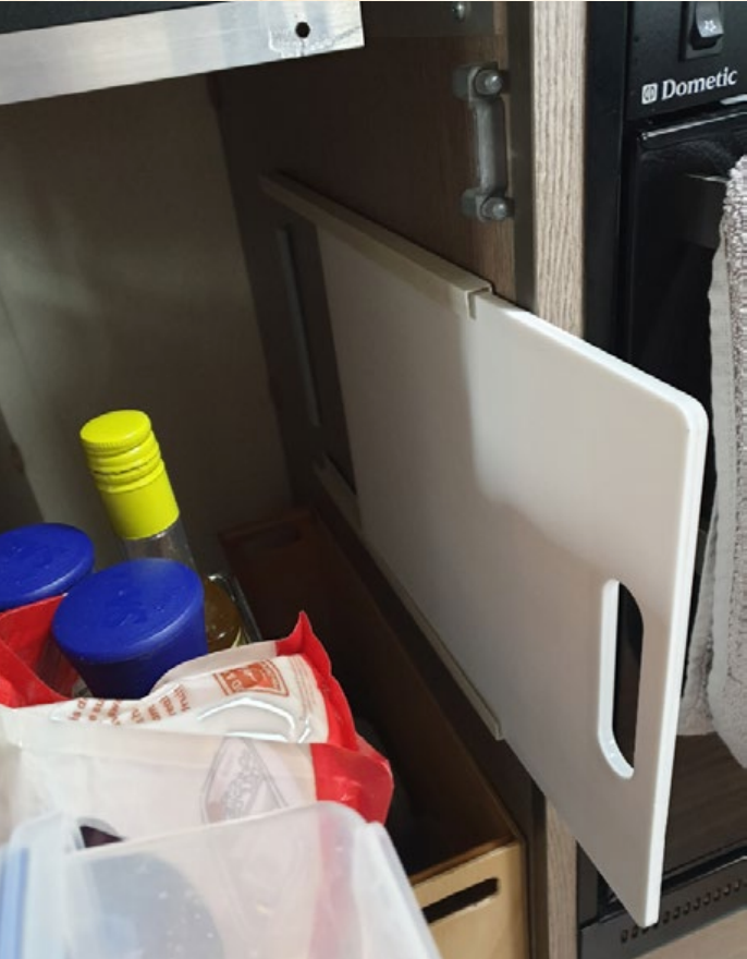 I’m sure every motorhome owner would agree that effective use of storage spaces is one of the secrets to successful travelling. Again, some of the things we’ve done have been designed specifically for the things we need to store. But others would be universal. For example, the cutting board: Surely everyone needs one of these, yet they are one of the most inconvenient things to stow. If you just toss them in a drawer they move around and rattle, and get in the way of other stuff in the drawer. I’ve solved this by adapting suitable pieces of plastic extrusion, into which the cutting board can be slid when not in use. Ours is on the side of the pantry compartment.