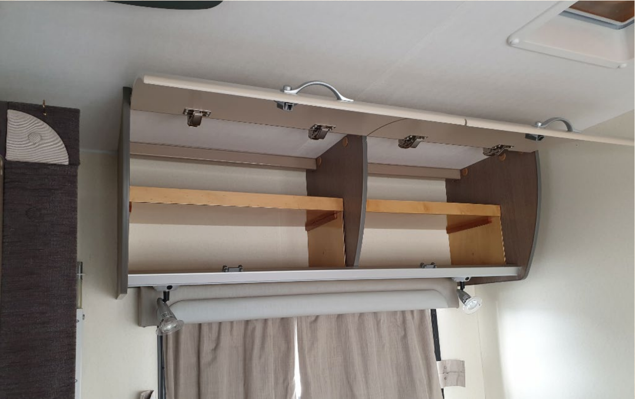 Another feature common to our Esperance and our previous Sunliner is the generous height of the clothes storage lockers above the bed. The down side of the height is that there’s usually a lot of wasted space on top of the clothes. Either that, or the stack of clothes becomes so high that it’s difficult to access what you want, or the stack falls over. We’ve added internal shelving constructed from plywood to solve these problems and make much more convenient use of all the space available.