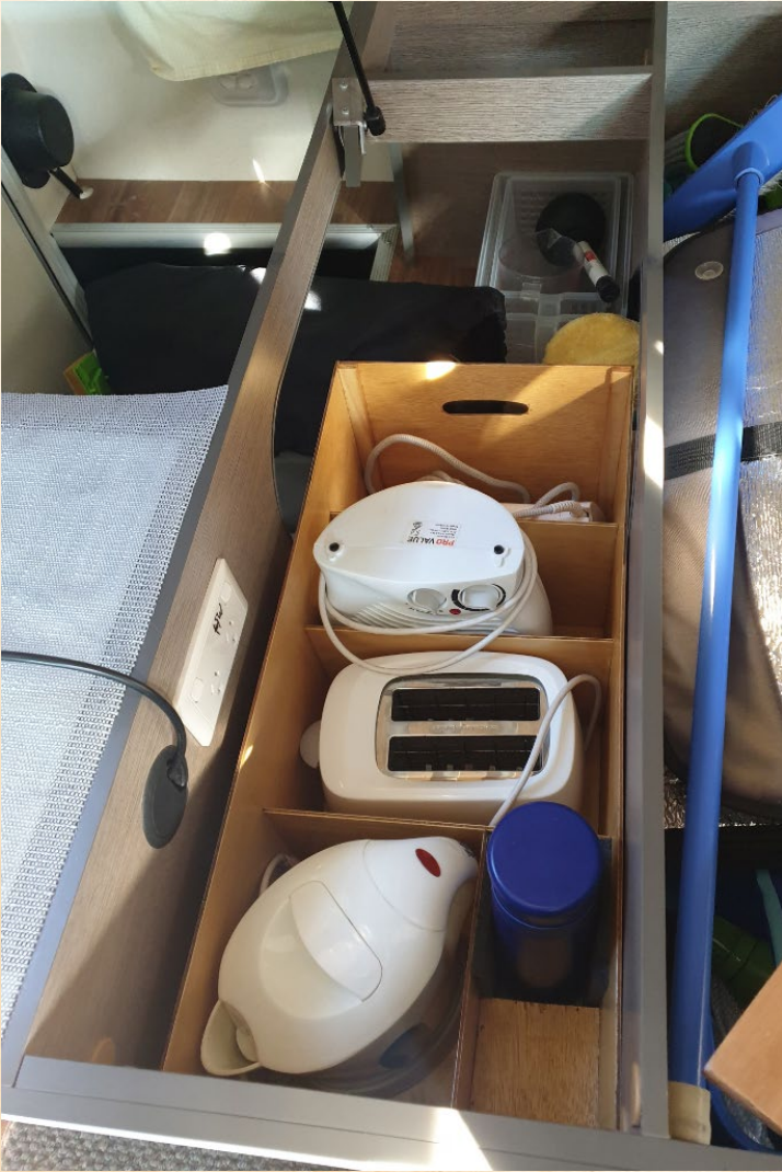 Next came a box to fit under the bed, for storing kitchen appliances like the electric kettle, toaster, fan heater, iron, etc. We previously stored these under the bed in their original cardboard boxes, but these get very scrappy with repeated use and were a pain to use. Making a purpose-built box divided into compartments (incorporating a suitable blockout for one of the diesel heater ducts), solved this problem. It’s so much easier to use and actually saved quite a lot of space, because the cardboard boxes are generally oversized for the appliance they contain.