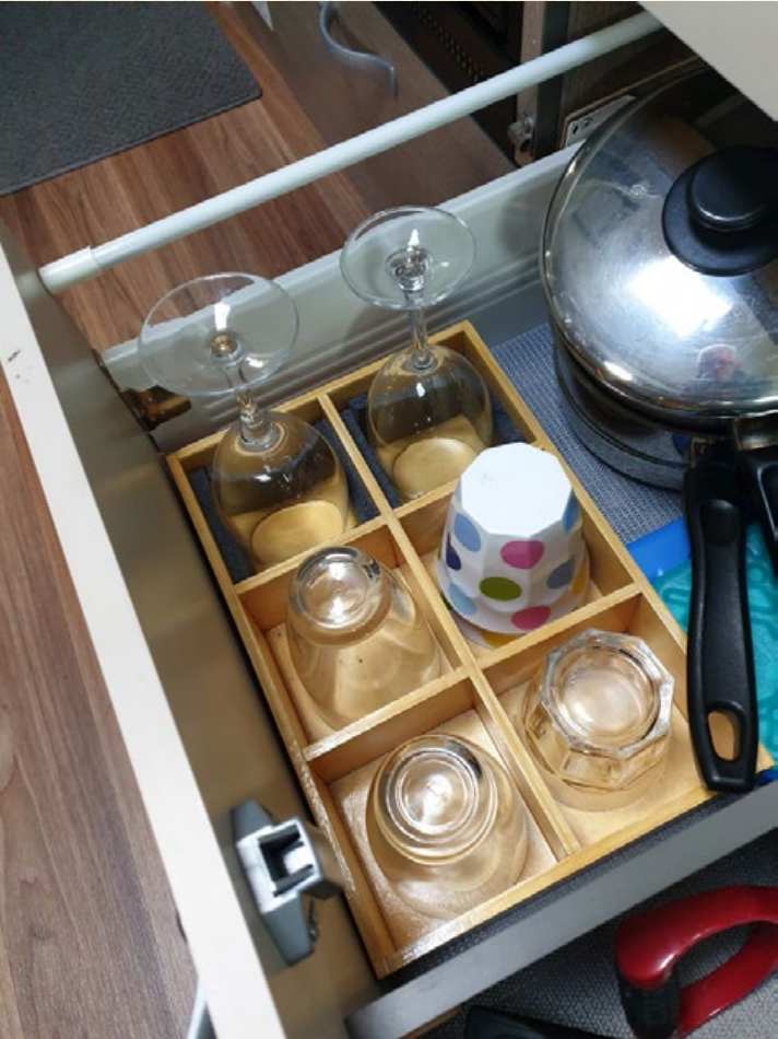 Still on the matter of storage, more trips to the plywood retailer were required so I could make some purpose-built boxes. One was a simple enough box, to store glassware. I’ve tried various proprietary setups sold by caravan/motorhome retailers, but a simple box seems to work best for us.