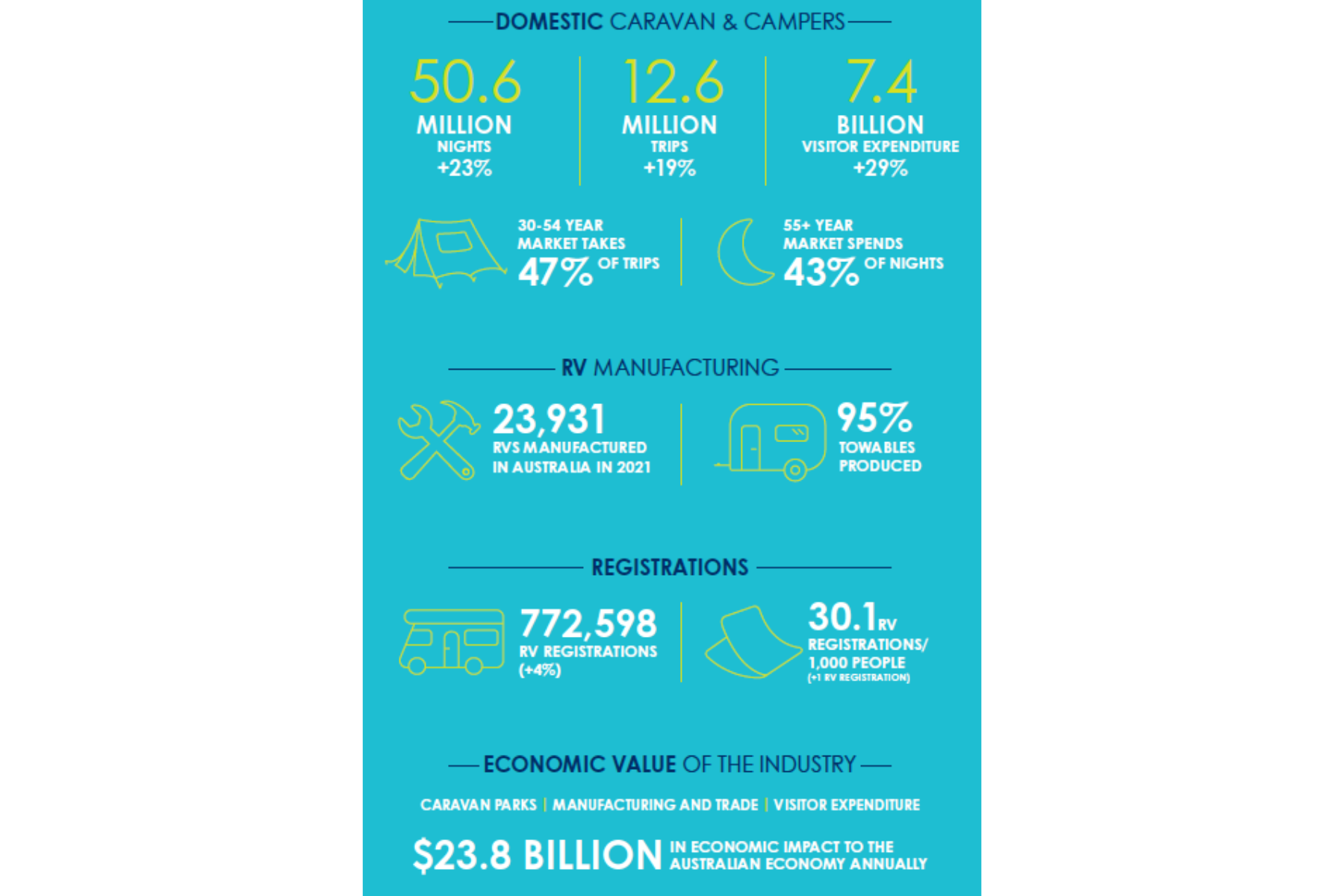 The report, which slightly confusingly covers 2021, says a record $23.8 billion was added to the Australian economy through a combination of domestic RV travel and camping activities, plus RV manufacturing, service, parts and support.