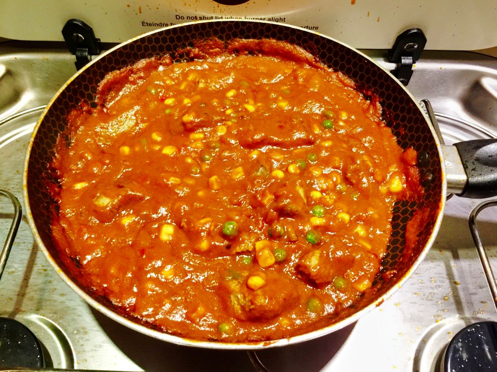 - Poured the contents over the beef, turned the heat down and let simmer for the suggested 10 minutes, occasionally stirring